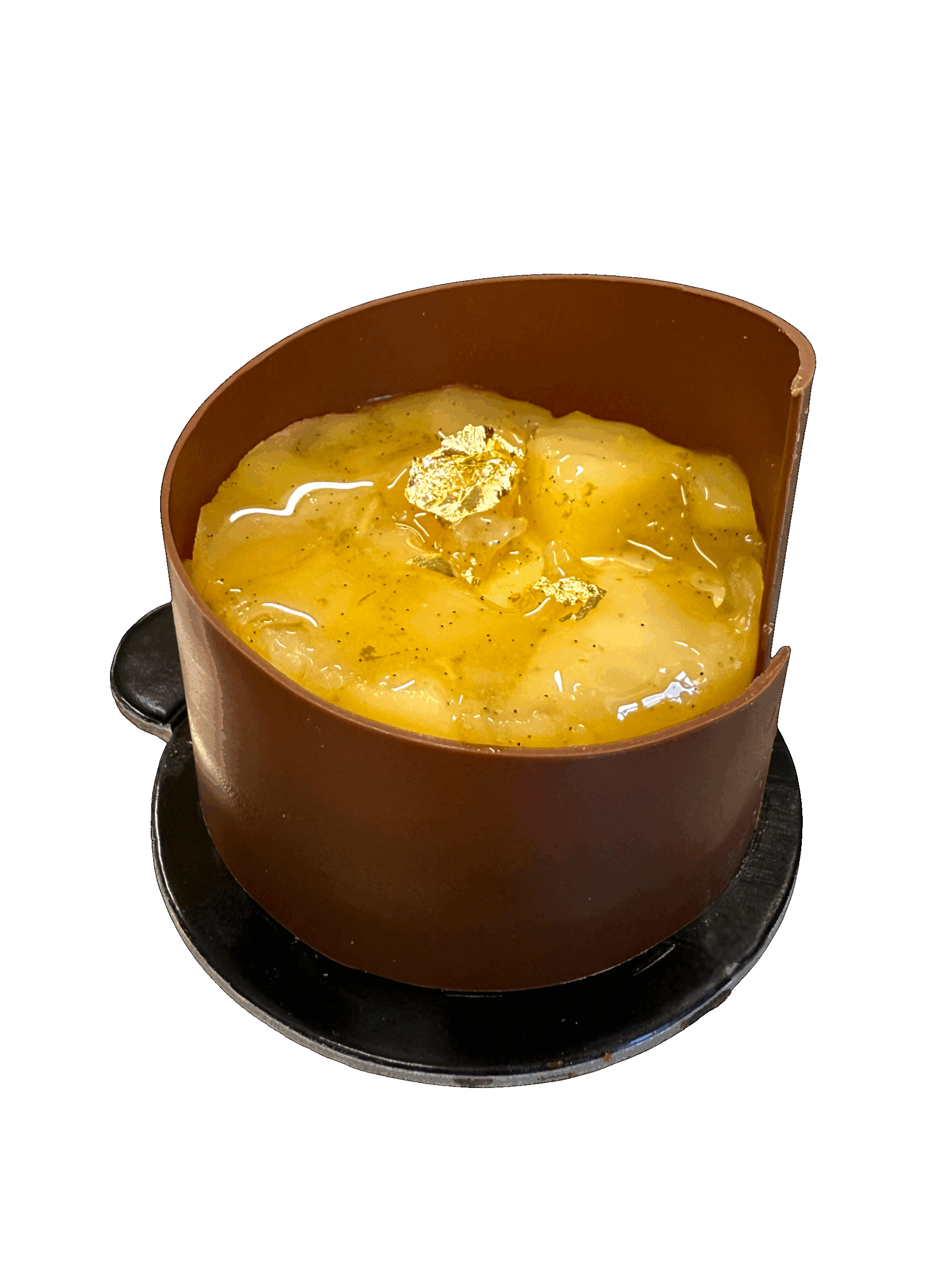 Biscuit 4 épices, compotée de poire citron gingembre parfumé à l’alcool de poire citron gingembre parfumé à l’alcool de poire. Caramel beurre salé, crème vanille.